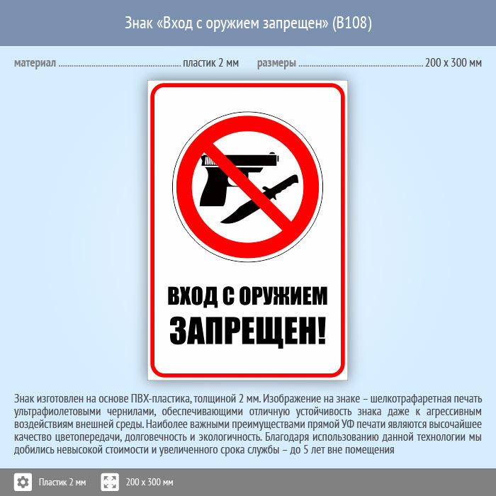 Знак «Вход с оружием запрещен», B108 (пластик, 200х300 мм) в Твери купить