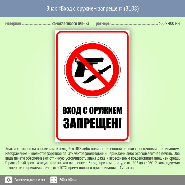 Знак «Вход с оружием запрещен», B108 (пленка, 300х400 мм) в Твери купить