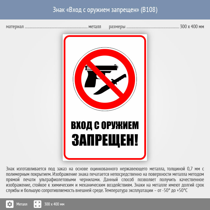 Знак «Вход с оружием запрещен», B108 (металл, 300х400 мм) в Твери купить