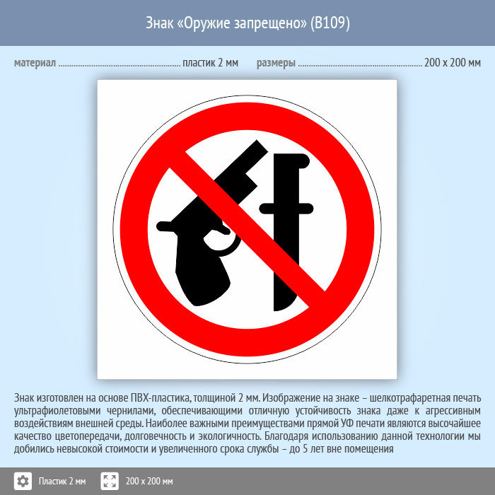 Знак «Оружие запрещено», B109 (пластик, 200х200 мм) в Твери купить