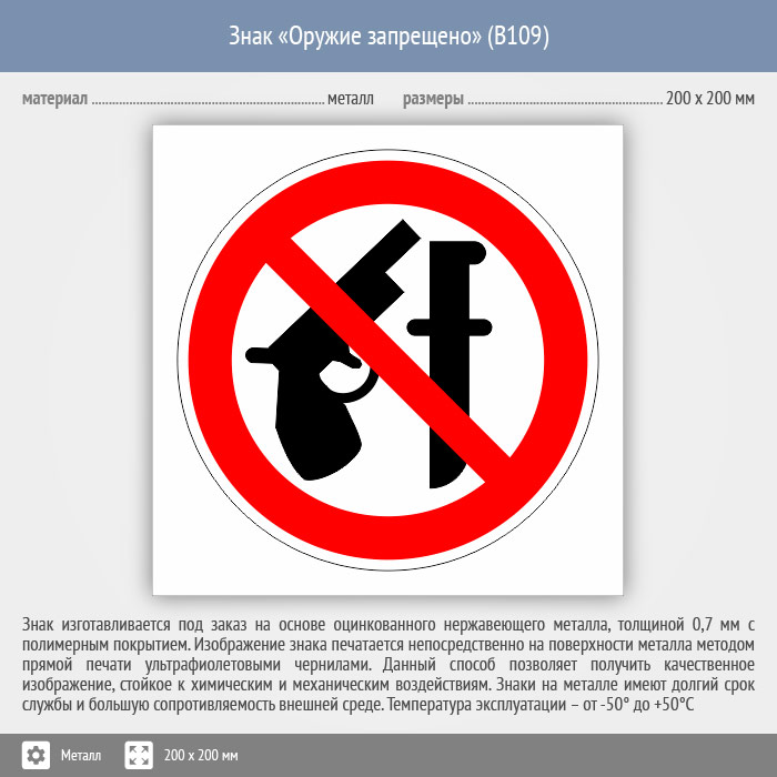 Знак «Оружие запрещено», B109 (металл, 200х200 мм) в Твери купить