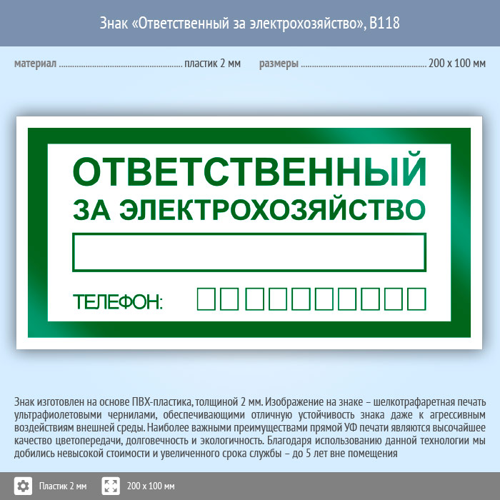 Знак «Ответственный за электрохозяйство», B118 (пластик, 200х100 мм) в Твери купить
