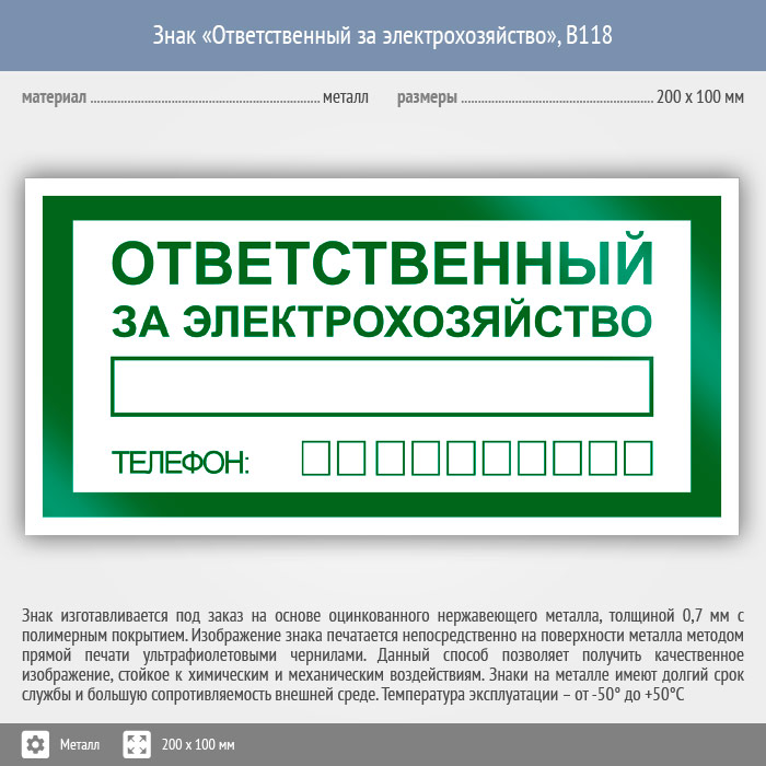 Знак «Ответственный за электрохозяйство», B118 (металл, 200х100 мм) в Твери купить