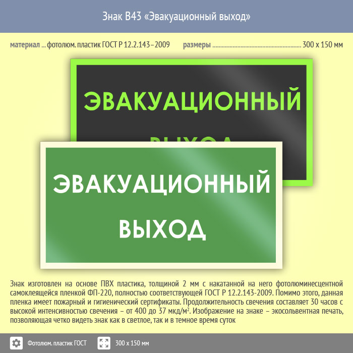 Знак B43 «Эвакуационный выход» (фотолюминесцентный пластик ГОСТ 34428-2018, 300х150 мм) в Твери купить
