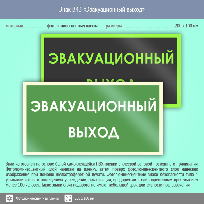 Знак B43 «Эвакуационный выход» (фотолюминесцентная пленка ГОСТ 34428-2018, 200х100 мм) в Твери купить