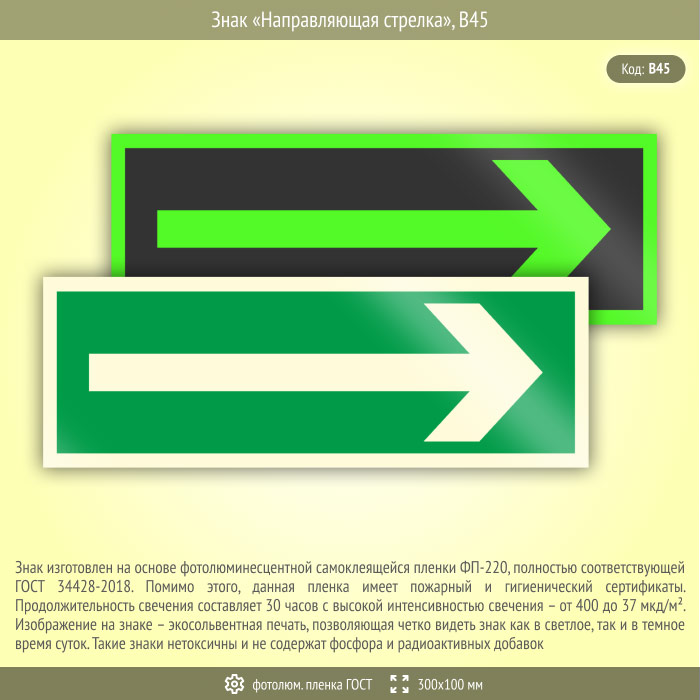 Знак «Направляющая стрелка», B45 (фотолюминесцентная пленка ГОСТ 34428-2018, 300х100 мм) в Твери купить
