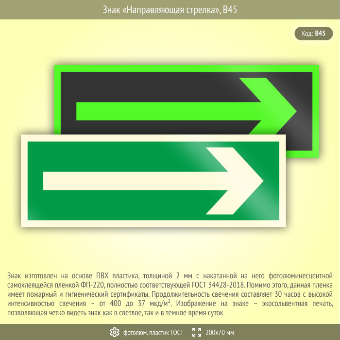 Знак «Направляющая стрелка», B45 (фотолюминесцентный пластик ГОСТ 34428-2018, 200х70 мм) в Твери купить
