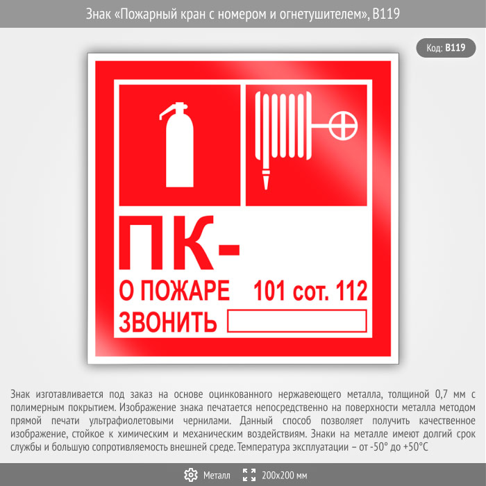 Знак «Пожарный кран с номером и огнетушителем», B119 (металл, 200х200 мм) в Твери купить