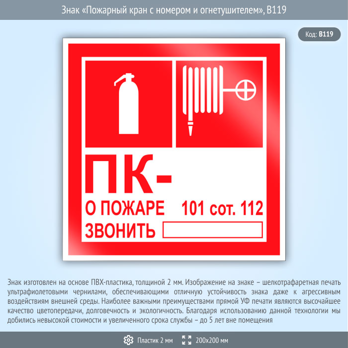 Знак «Пожарный кран с номером и огнетушителем», B119 (пластик, 200х200 мм) в Твери купить