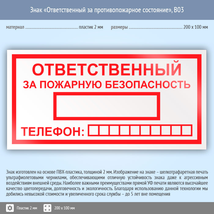 Знак «Ответственный за пожарную безопасность», B03 (пластик, 200х100 мм) в Твери купить