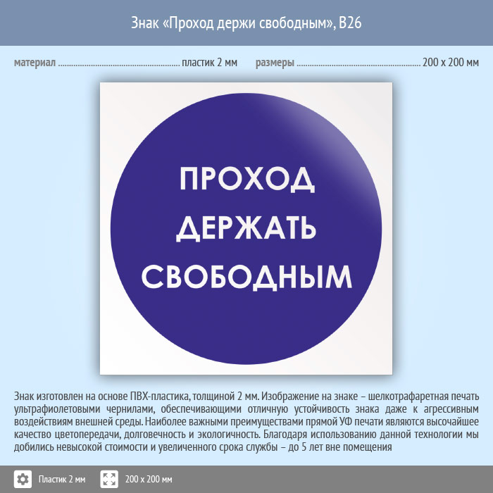 Знак «Проход держи свободным», B26 (пластик, 200х200 мм) в Твери купить