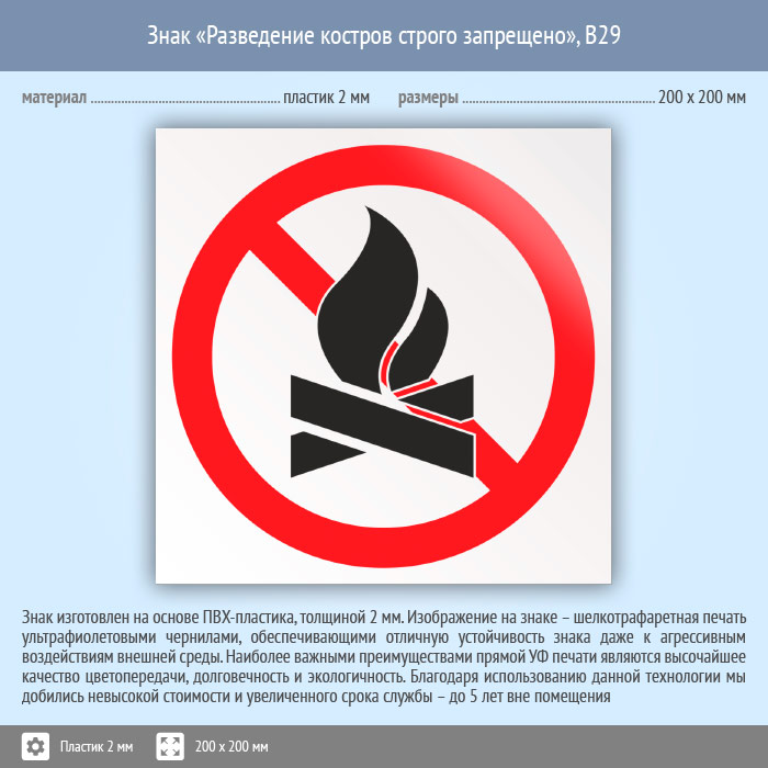 Знак «Разведение костров строго запрещено», B29 (пластик, 200х200 мм) в Твери купить