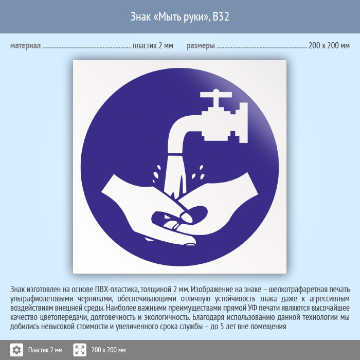 Знак «Мыть руки», B32 (пластик, 200х200 мм) в Твери купить