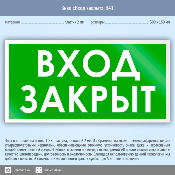 Знак «Вход закрыт», B41 (пластик, 300х150 мм) в Твери купить