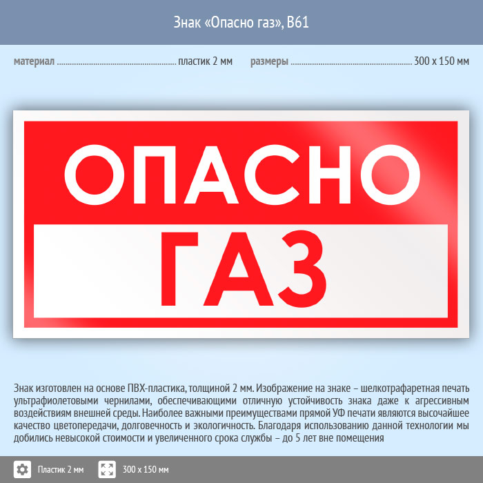 Знак «Опасно газ», B61 (пластик, 300х150 мм) в Твери купить