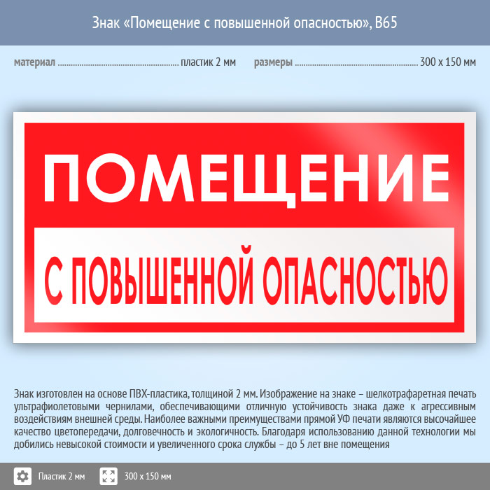 Знак «Помещение с повышенной опасностью», B65 (пластик, 300х150 мм) в Твери купить