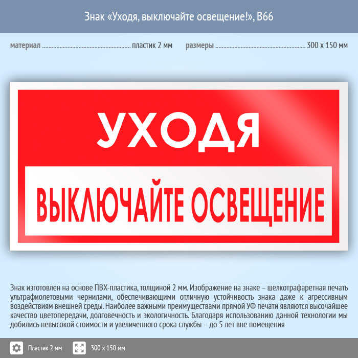 Знак «Уходя, выключайте освещение!», B66 (пластик, 300х150 мм) в Твери купить