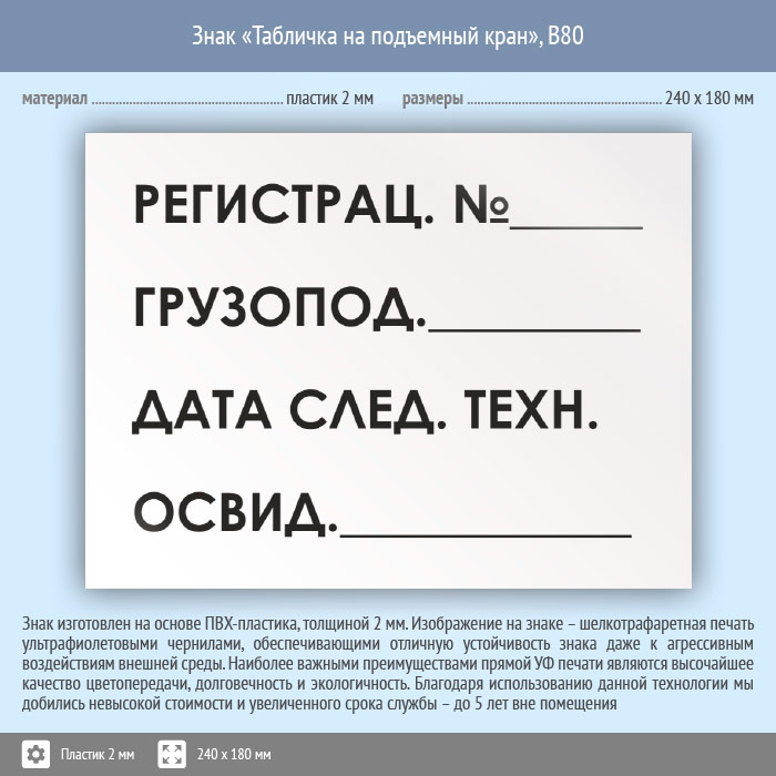 Знак «Табличка на подъемный кран», B80 (пластик, 240х180 мм) в Твери купить