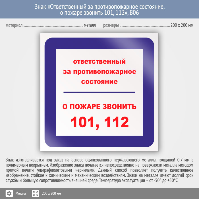 Знак «Ответственный за противопожарное состояние, о пожаре звонить 101, 112», B06 (металл, 200х200 мм) в Твери купить