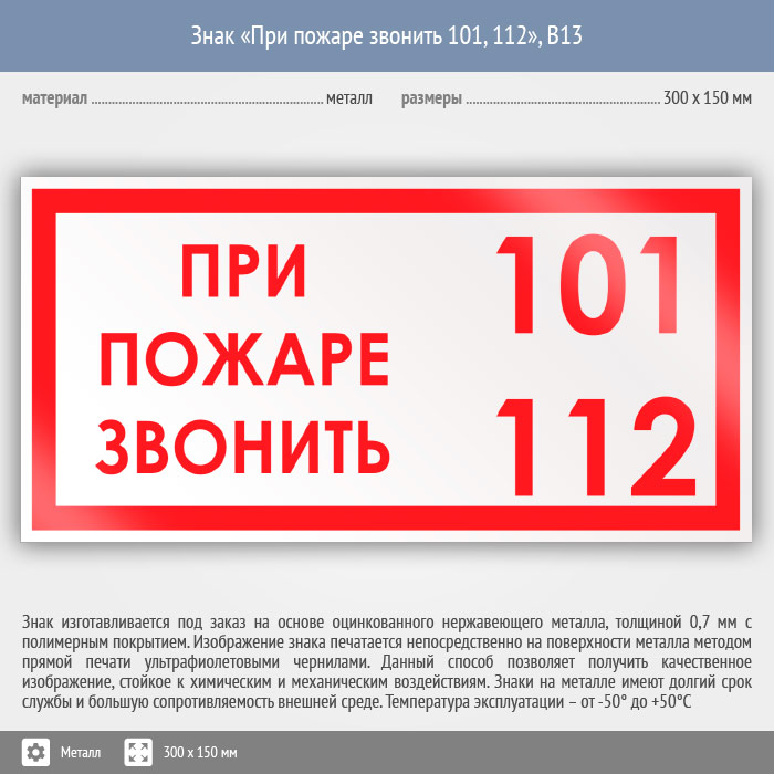 Знак «При пожаре звонить 101, 112», B13 (металл, 300х150 мм) в Твери купить