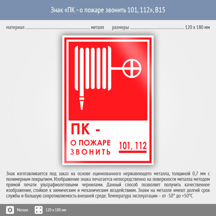 Знак «ПК - о пожаре звонить 101, 112», B15 (металл, 120х180 мм) в Твери купить