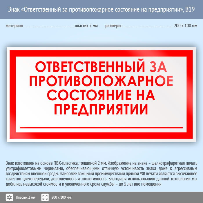 Знак «Ответственный за противопожарное состояние на предприятии», B19 (пластик, 200х100 мм) в Твери купить