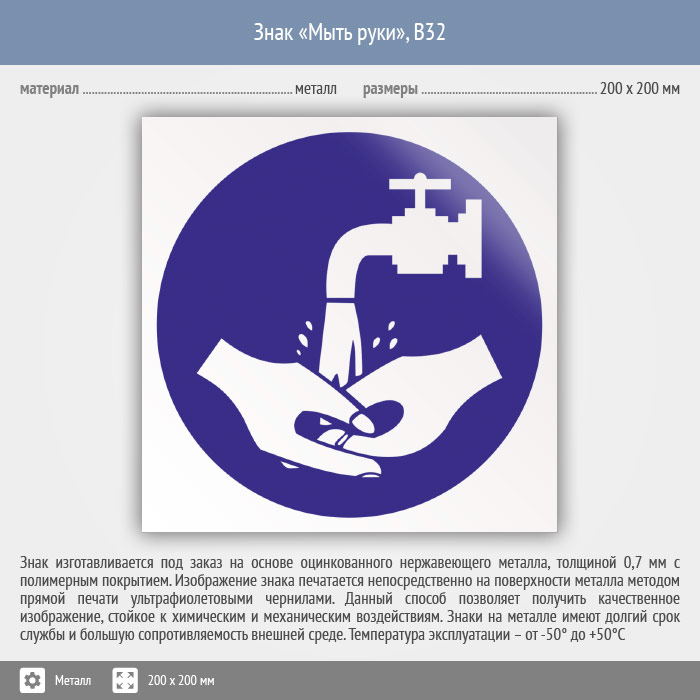 Знак «Мыть руки», B32 (металл, 200х200 мм) в Твери купить