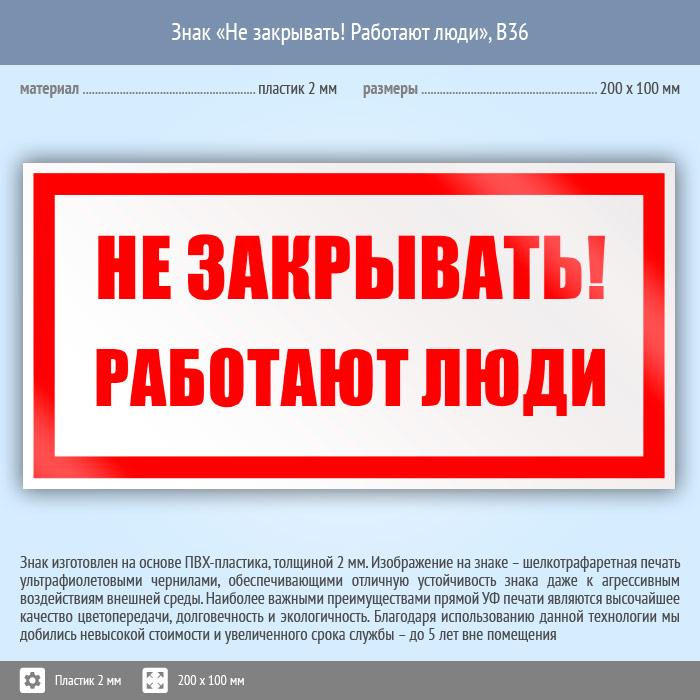 Знак «Не закрывать! Работают люди», B36 (пластик, 200х100 мм) в Твери купить