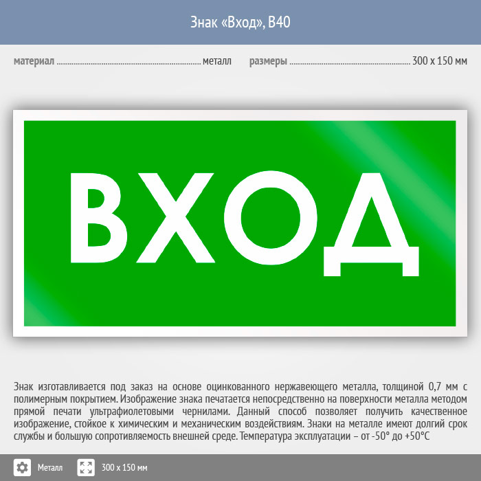 Знак «Вход», B40 (металл, 300х150 мм) в Твери купить