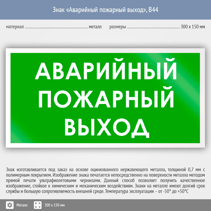 Знак «Аварийный пожарный выход», B44 (металл, 300х150 мм) в Твери купить