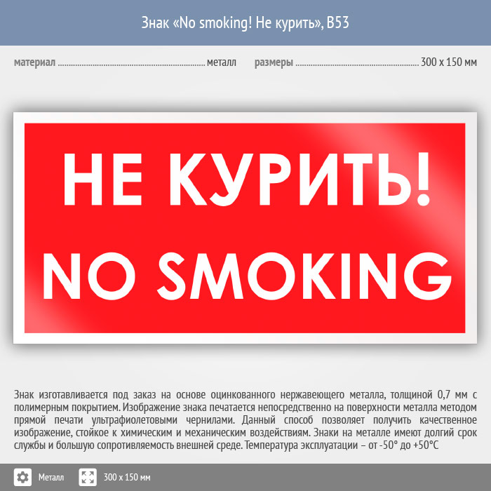 Знак «No smoking! Не курить», B53 (металл, 300х150 мм) в Твери купить
