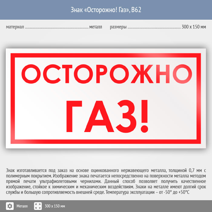 Знак «Осторожно! Газ», B62 (металл, 300х150 мм) в Твери купить