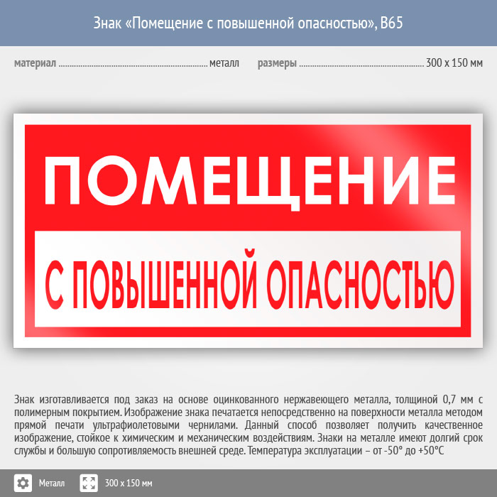 Знак «Помещение с повышенной опасностью», B65 (металл, 300х150 мм) в Твери купить