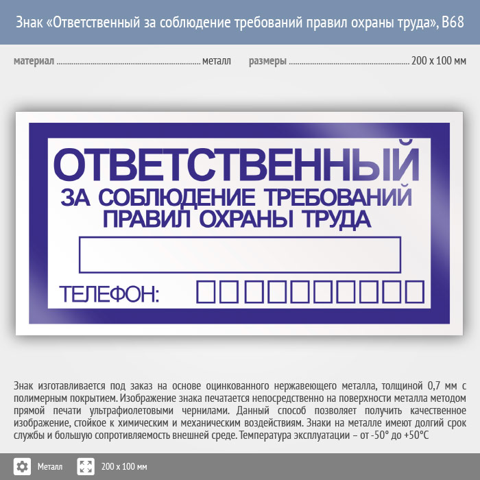 Знак «Ответственный за соблюдение требований правил охраны труда», B68 (металл, 200х100 мм) в Твери купить