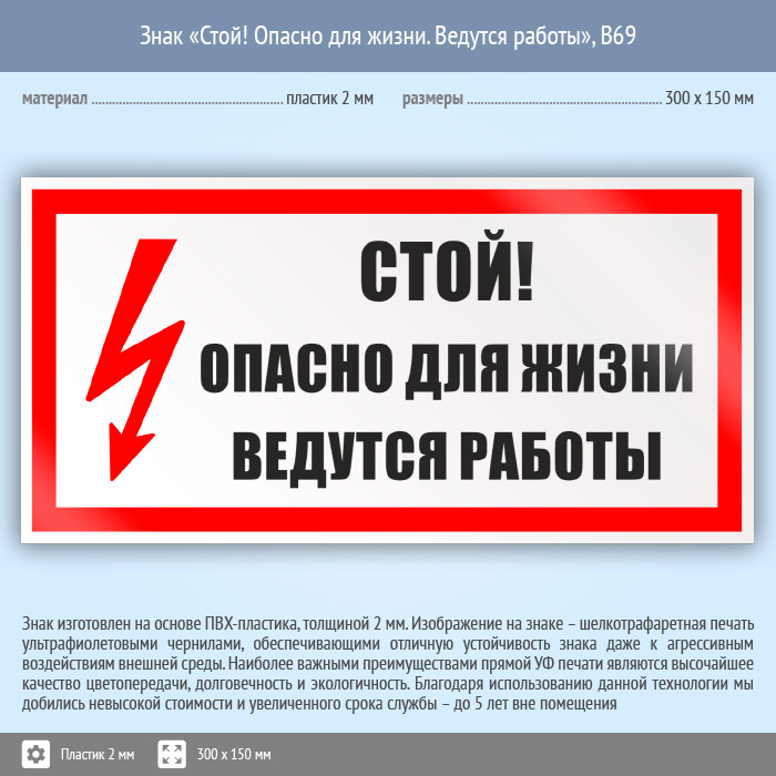 Знак «Стой! Опасно для жизни. Ведутся работы», B69 (пластик, 300х150 мм) в Твери купить