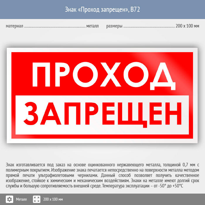 Знак «Проход запрещен», B72 (металл, 200х100 мм) в Твери купить
