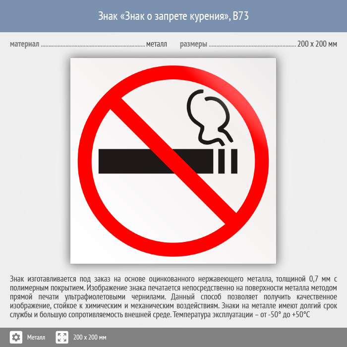 Знак «Знак о запрете курения», B73 (металл, 200х200 мм) в Твери купить