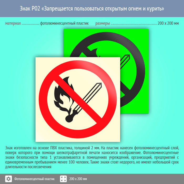 Знак P02 «Запрещается пользоваться открытым огнем и курить» (фотолюминесцентный пластик, 200х200 мм) в Твери купить