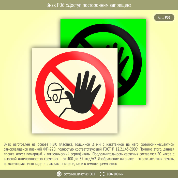 Знак P06 «Доступ посторонним запрещен» (фотолюминесцентный пластик ГОСТ 34428-2018, 100х100 мм) в Твери купить