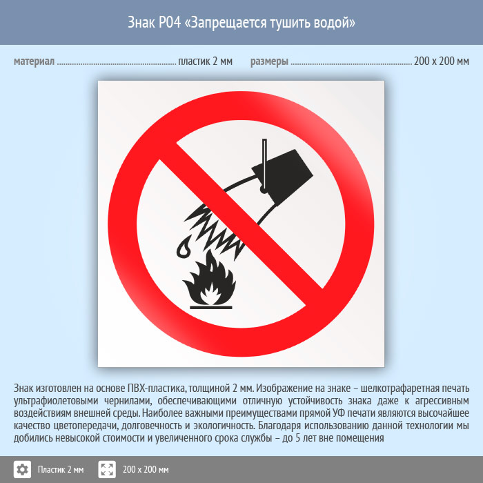 Знак P04 «Запрещается тушить водой» (пластик, 200х200 мм) в Твери купить