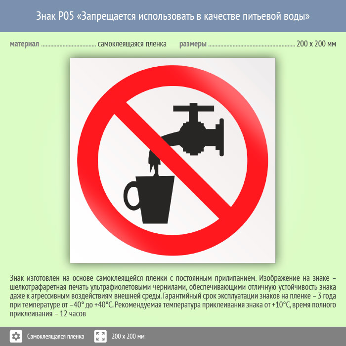 Знак P05 «Запрещается использовать в качестве питьевой воды» (пленка, 200х200 мм) в Твери купить