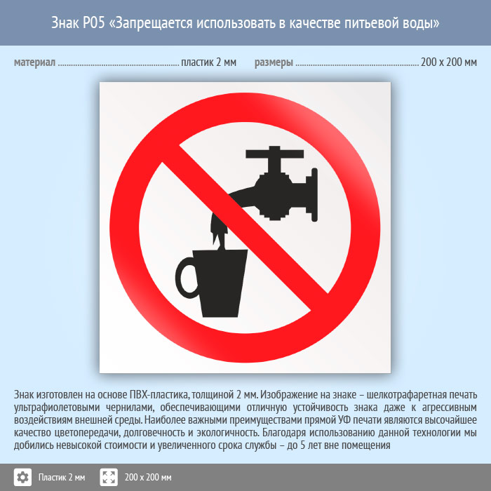 Знак P05 «Запрещается использовать в качестве питьевой воды» (пластик, 200х200 мм) в Твери купить