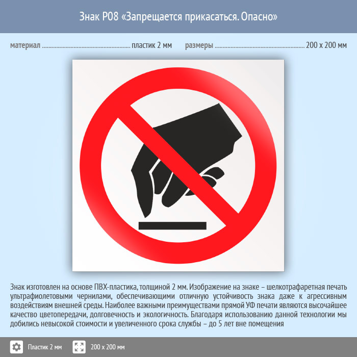 Знак P08 «Запрещается прикасаться. Опасно» (пластик, 200х200 мм) в Твери купить