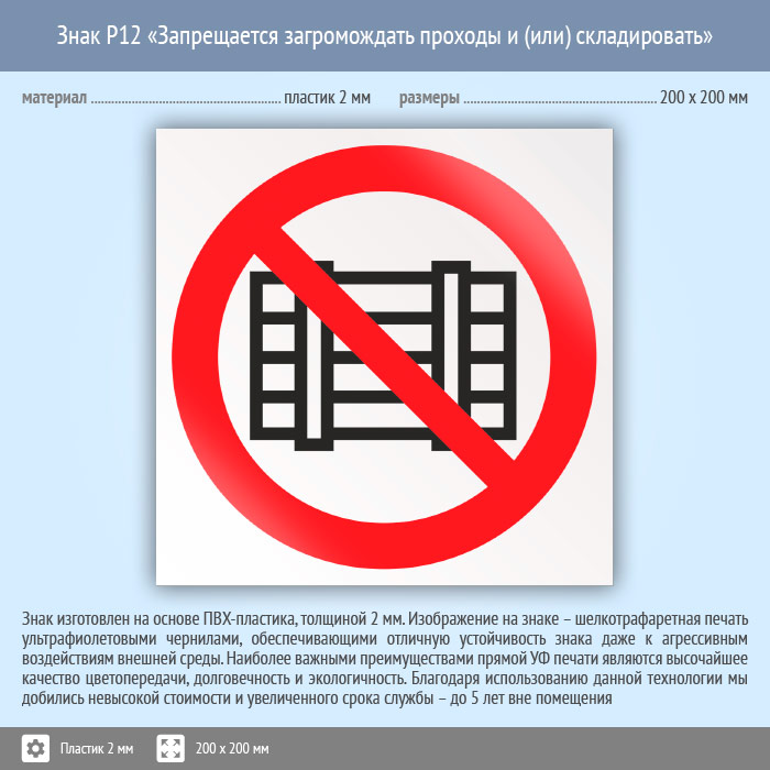 Знак P12 «Запрещается загромождать проходы и (или) складировать» (пластик, 200х200 мм) в Твери купить