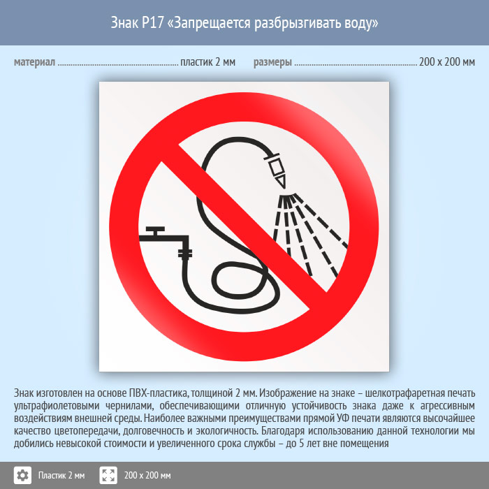 Знак P17 «Запрещается разбрызгивать воду» (пластик, 200х200 мм) в Твери купить