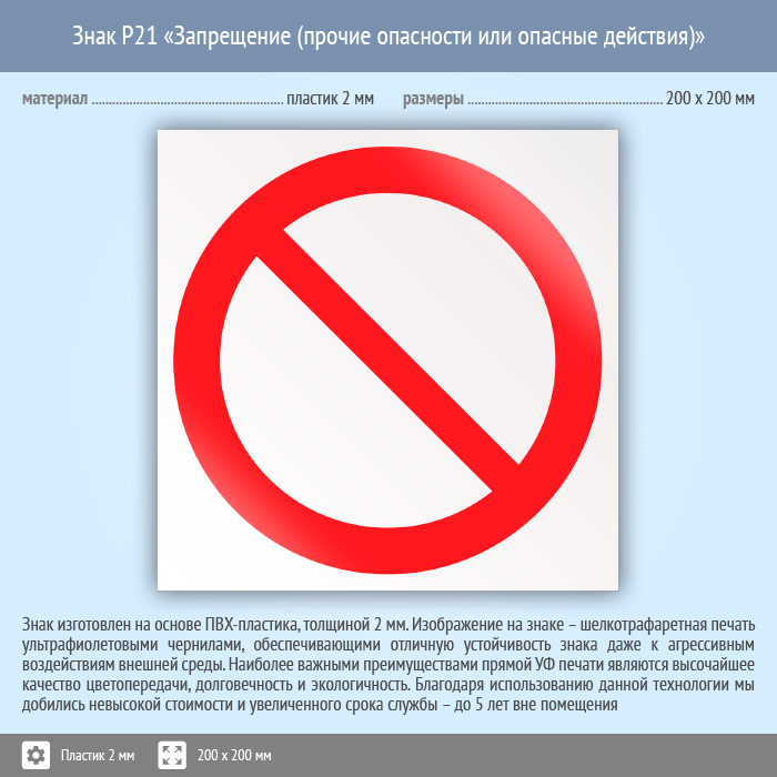 Знак P21 «запрещение (прочие опасности или опасные действия)» (пластик, 200х200 мм) в Твери купить