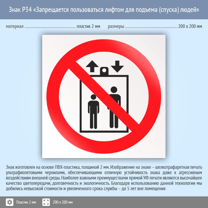 Знак P34 «Запрещается пользоваться лифтом для подъема (спуска) людей» (пластик, 200х200 мм) в Твери купить
