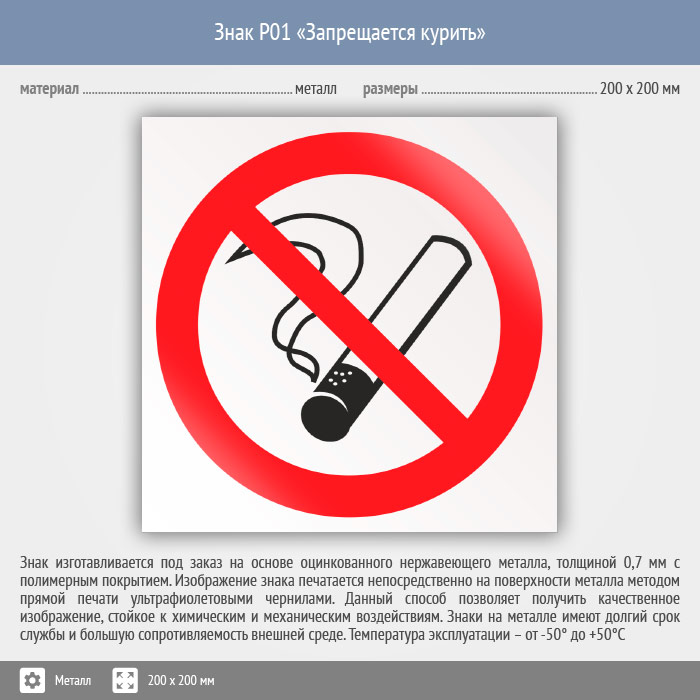 Знак P01 «Запрещается курить» (металл, 200х200 мм) в Твери купить