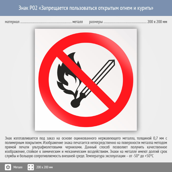 Знак P02 «Запрещается пользоваться открытым огнем и курить» (металл, 200х200 мм) в Твери купить