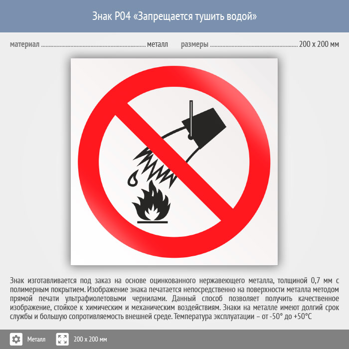 Знак P04 «Запрещается тушить водой» (металл, 200х200 мм) в Твери купить